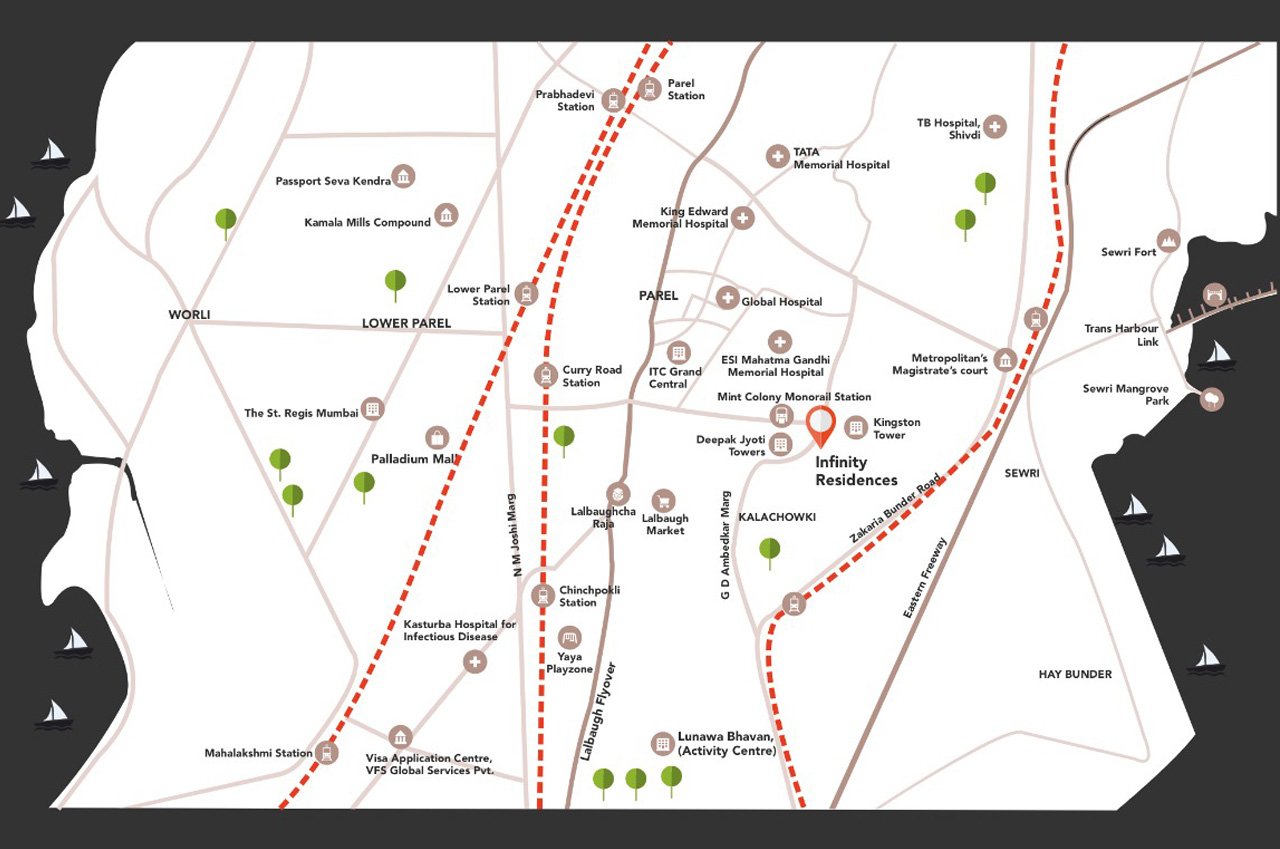 Parel is not only one of mumbai’s biggest commercial zones but also has strategicin roads into prominent south mumbai localities. Infinity residences is situated in one of the best residential localities of parel, giving you unprecedented access to bustling commercial hubs and institutions of leading corporates, hospitals, shopping malls, places of worship and schools and colleges.